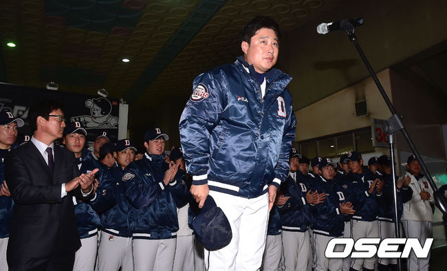 30일 서울 잠실구장에서 열린 두산 베어스의 '2014 곰들의 모임' 환담회에서 김태형 감독이 팬들에게 인사를 하고 있다