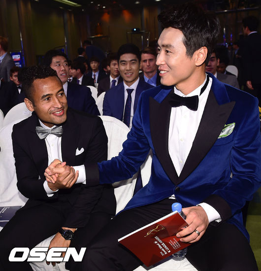 1일 오후 서울 서대문구 홍은동 그랜드힐튼호텔 컨벤션센터에서 열린 '2014 현대오일뱅크 K리그 대상' 시상식에서 차두리와 산토스, 이동국이 포즈를 취하고 있다.