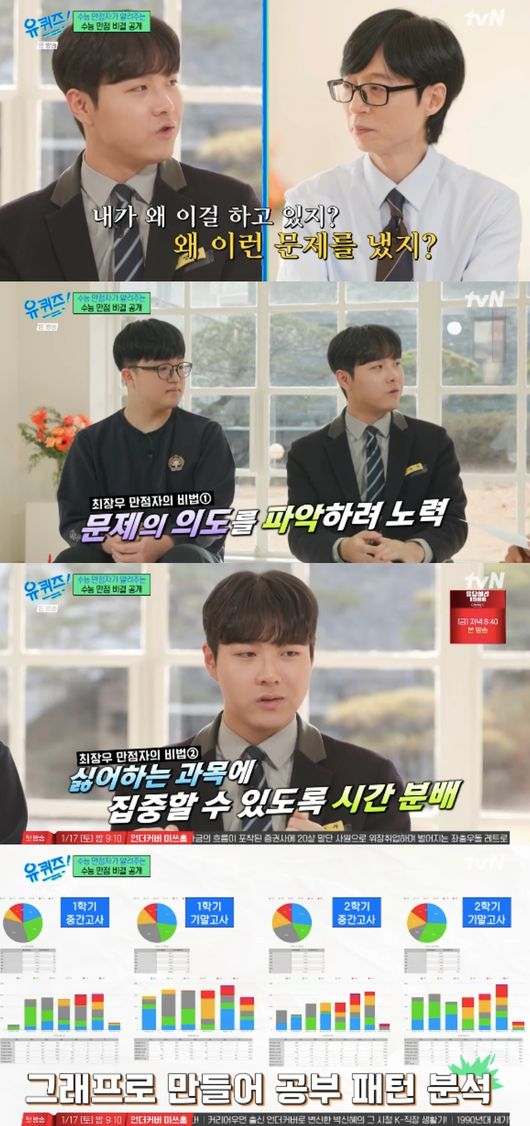 이날 최장우와 왕정건은 수능 만점 비결을 공개했다. 가장 먼저 최장우는 “저는 공부도 그렇고 뭘 할 때 ‘왜?’ 라는 질문을 많이 했다. ‘내가 이걸 왜 하고 있지?’, ‘왜 이런 문제를 냈지?’”라며 문제의 의도를 파악하려 노력했다고 밝혔다.