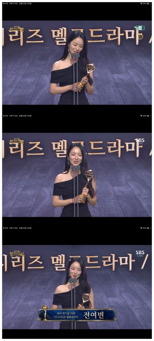 31일 오후 SBS 프리즘타워에서 열린 ‘2025 SBS 연기대상’에서는 멜로드라마 부문 우수연기상 여자로 배우 전여빈이 수상했다. 전여빈은 '우리 영화'에서 시한부 다은 역할을 맡아 남궁민과 잔잔하면서도 차분한 사랑을 나누는 이야기를 그려냈다.
