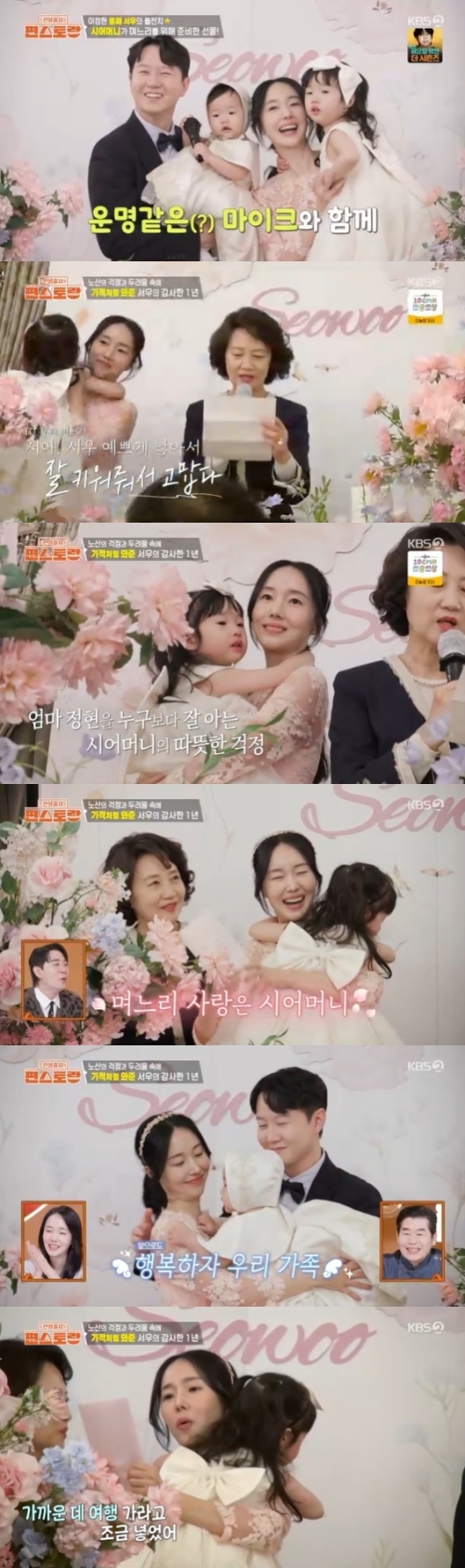 특히 이정현의 시어머니는 자리에서 일어나 흰 봉투를 들고 나왔고, 며느리를 위해서 직접 쓴 손 편지를 읽었다. 시어머니는 "큰며느리 정현이에게"라며 "서아, 서우 예쁘게 낳아서 잘 키워줘서 고맙다. 결혼 후 쉼없는 작품 활동과 대학원 공부로 바쁠 텐데도 여러 방면으로 남편 내조하느라 늘 수고가 많구나. 서아, 서우 잘 봐줄테니 둘이서 함께 여행이라도 다녀오렴"이라며 진심을 드러냈다. 여기에 "가까운 데 여행가라고 조금 넣었어"라며 센스 넘치는 현금도 선물도 잊지 않았다.