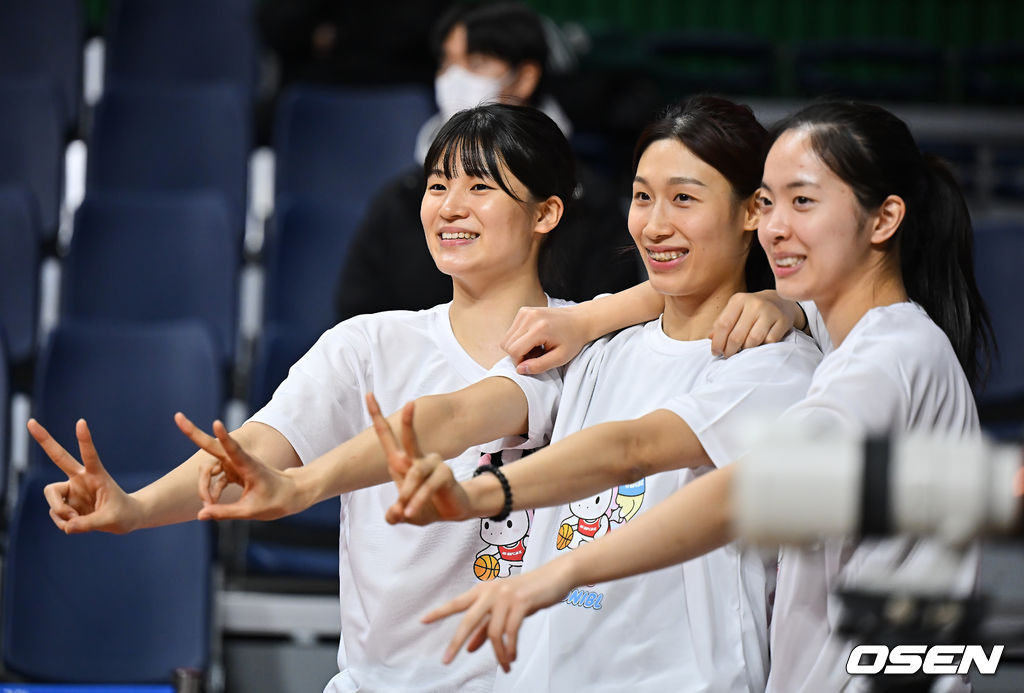 여자농구 올스타 변소정(BNK), 이해란(삼성생명), 박소희(하나은행)가 부산 유소녀 선수들과 W-페스티벌을 마치고 기념촬영을 하고 있다. 2026.01.03 / foto0307@osen.co.kr