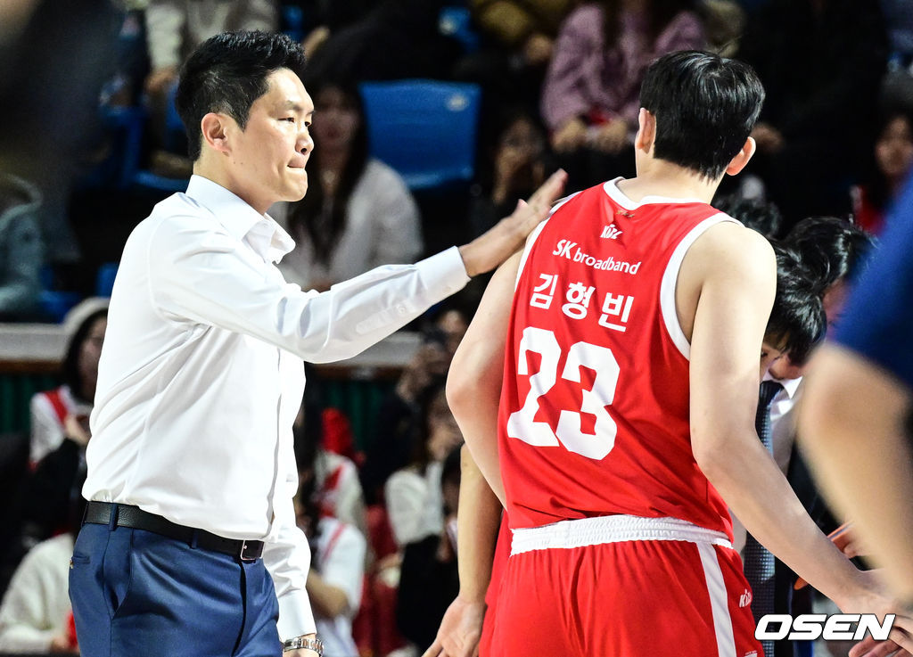 3쿼터 작전타임에 SK 전희철 감독이 김형빈의 등을 때리고 있다. 2026.01.03 /cej@osen.co.kr