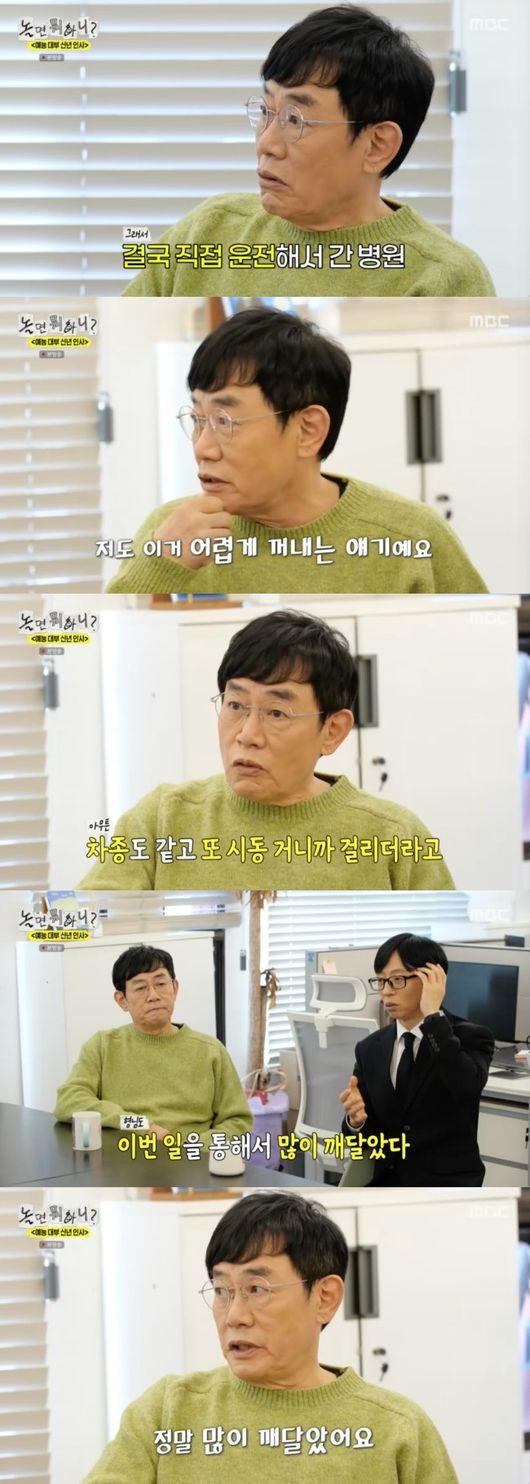 이경규는 “병원 갔다가 주사를 한대 맞고, 몸살 기운이 너무 심해서 어지러운 거다. 차가 내 차랑 똑같이 생긴 거다. 차를 탔는데 기종도 똑같고 시동 걸리니까 걸리더라. 그러니까 갔다”라고 밝혔다.