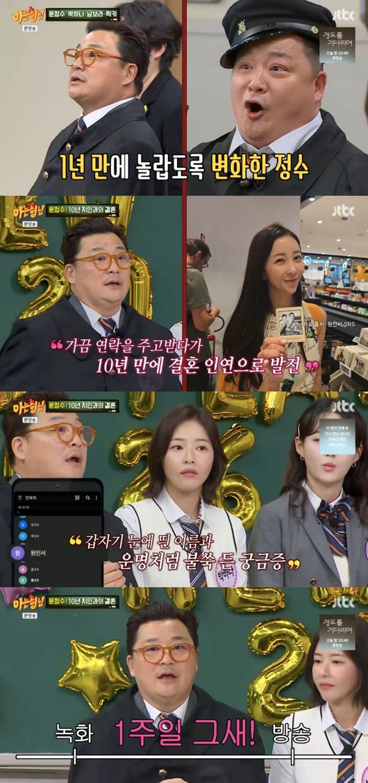 녹화일 기준, 결혼 4일차라는 윤정수는 아내 원진서와의 인연에 대해 ‘10년 지인’이라고 이야기했다. 그는 “10년 전에 방송할 때 게스트로 나오신 분이다. 연락을 가금 주고 받다가 이번에 연락이 핫하게 돼서 결혼하게 됐다”라고 결혼하게 된 이유를 밝혔다.