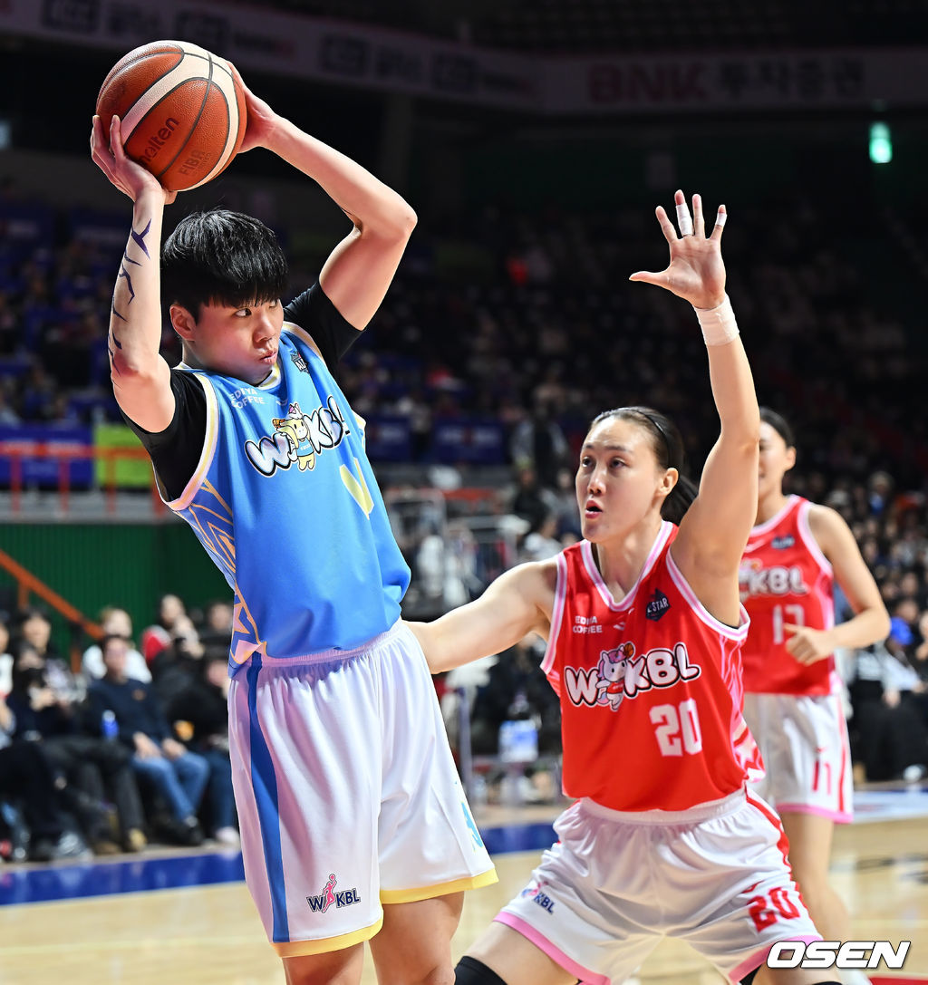 팀 포니블 진안(하나은행)이 팀 유니블 김정은(하나은행)의 마크를 피해 패스하고 있다. 2026.01.04 / foto0307@osen.co.kr