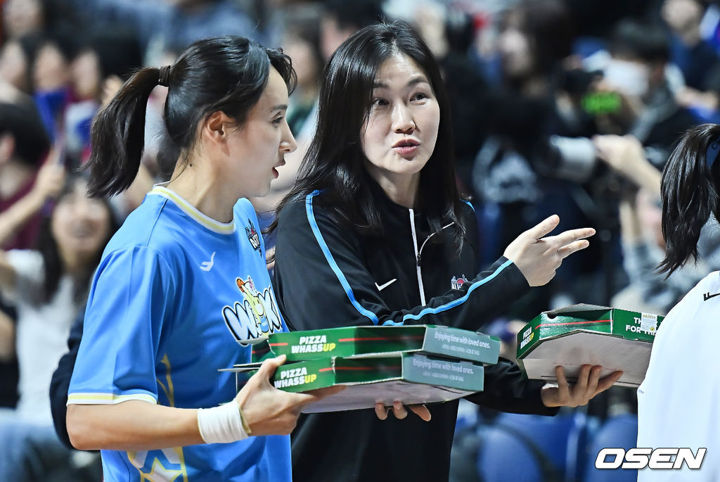 팀 포니블 박정은(BNK)감독과 김단비(우리은행)가 팬들에게 피자배달을 하고 있다. 2026.01.04 / foto0307@osen.co.kr