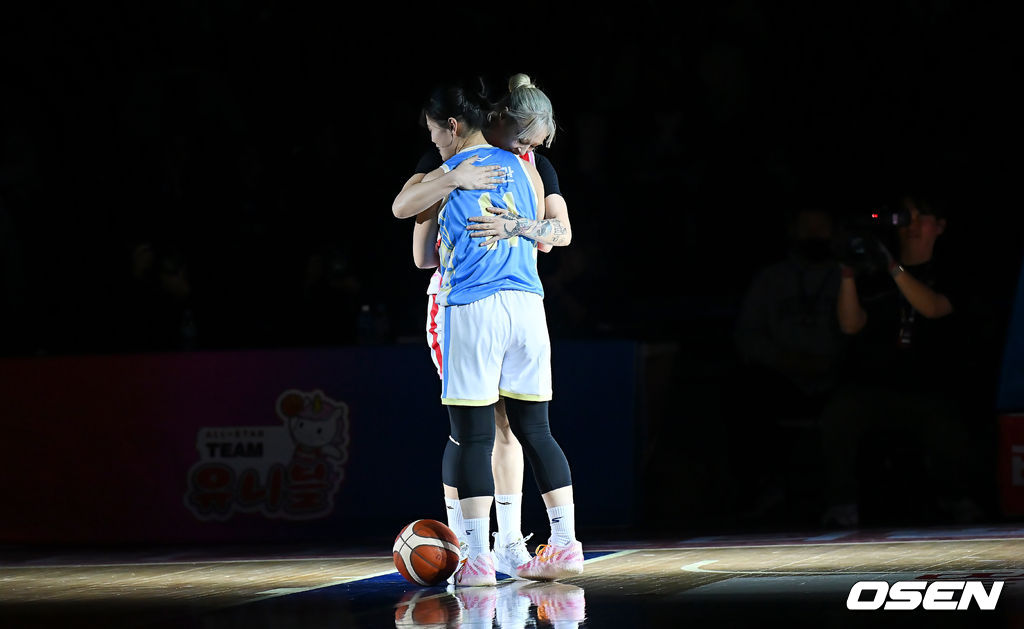 팀 유니블 김소니아(BNK)와 팀 포니블 이명관(우리은행)이 포옹을 하고 있다. 2026.01.04 / foto0307@osen.co.kr