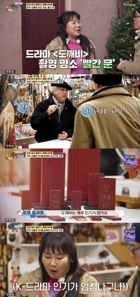 이어 두 사람은 쁘띠 샹플랭 거리 가운데 눈에 띄는 가게 소품샵을 찾았다. 아기자기한 소품부터 수준급 목각 제품들이 있었는데. 강민경은 한글로 ‘도깨비’라고 새겨진 빨간문 목각 제품에 “한글 누가 쓰신 거냐”라고 물었다.