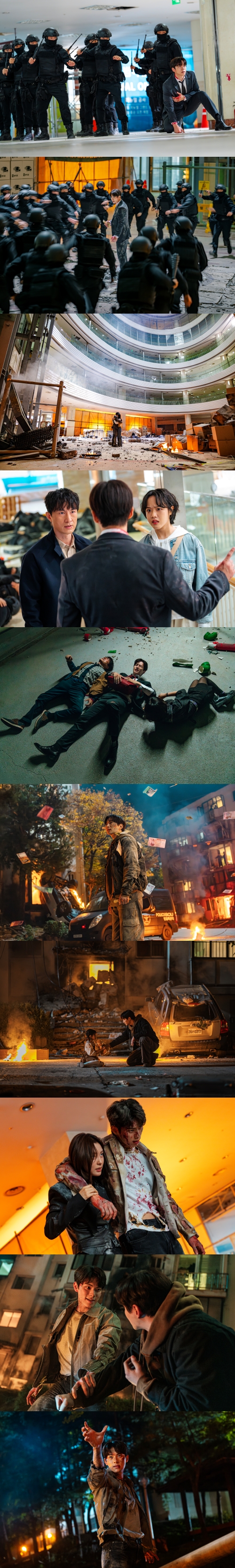 ‘범인회’와 대립하는 ‘상웅’(이준호)의 모습은 세상과 생계 사이에서 딜레마에 빠져 있던 과거를 뒤로하고, 진심을 다해 빌런과 맞서 싸우는 ‘캐셔로’의 면모를 떠올리게 한다. 엉망이 된 건물 안에서 서로를 꼭 끌어안은 ‘상웅’과 ‘민숙’(김혜준)의 모습은 위기의 순간에도 함께하며 서로를 지키는 두 사람의 감동적인 순간을 엿보게 한다. ‘변호인’(김병철)과 ‘방은미’(김향기)의 고군분투가 담긴 스틸들은 술에 취해야 하고, 많은 빵을 먹어야만 능력을 쓸 수 있음에도 끝까지 ‘상웅’을 돕는 ‘TEAM 상웅’의 끈끈한 팀워크를 보여준다.