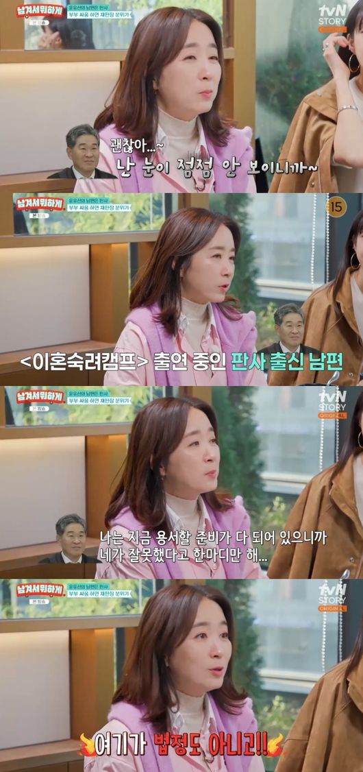 윤유선은 “남편이 화를 안 내는 편이다. 상대방의 입장에서 잘 생각하는 편이다. 근데 한번 화가 나면 잘 안 풀어지고 ‘나는 지금 용서할 준비가 되어 있어. 미안해 한 마디만 해’라고 하더라. 여기가 법정도 아니고 입장이 다른 거지 이야기했더니 그 다음부터 안하더라”라고 털어놨다.