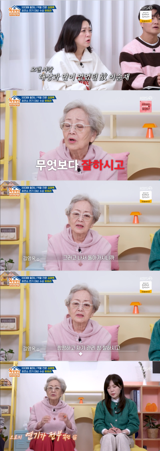 김영옥은 "이순재 선생님은 실제 나보다 3살이나 위인데 내 아들 역할을 하셨다"며 "신구 선생님과 이순재 선생님이 내 제일 늙은 아들들"이라고 말해 현장에 웃음과 놀라움을 동시에 안겼다.