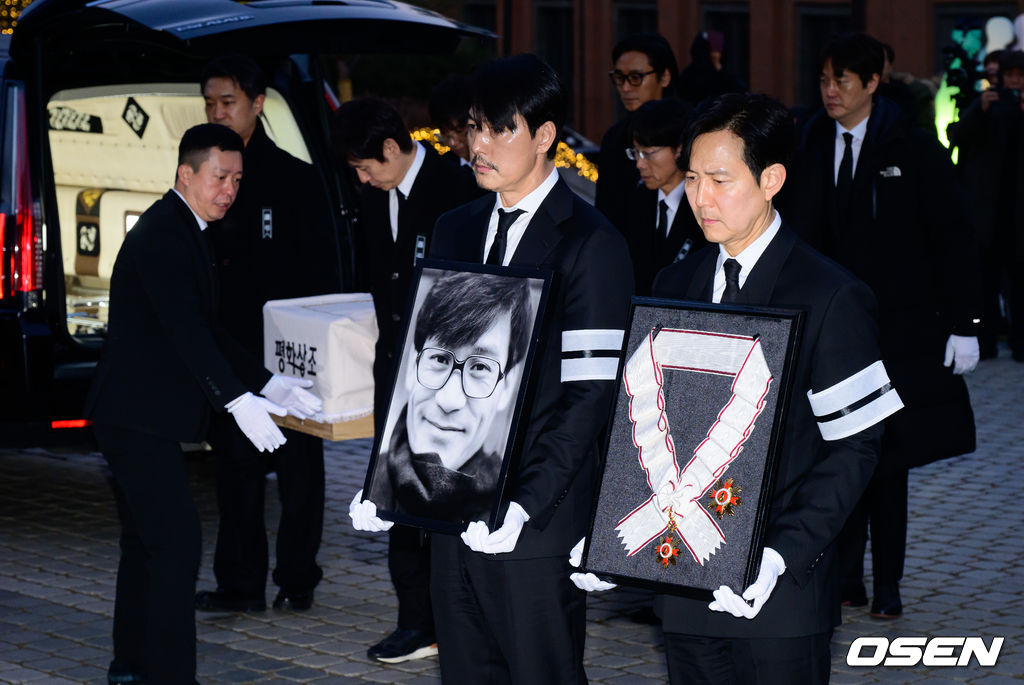 영결식에서는 고인의 마지막 소속사 아티스트컴퍼니의 수장인 정우성과 이정재가 각각 영정과 훈장을 들며 고인을 배웅한다. 운구는 설경구, 박철민, 유지태, 박해일, 조우진, 주지훈이 맡았다.