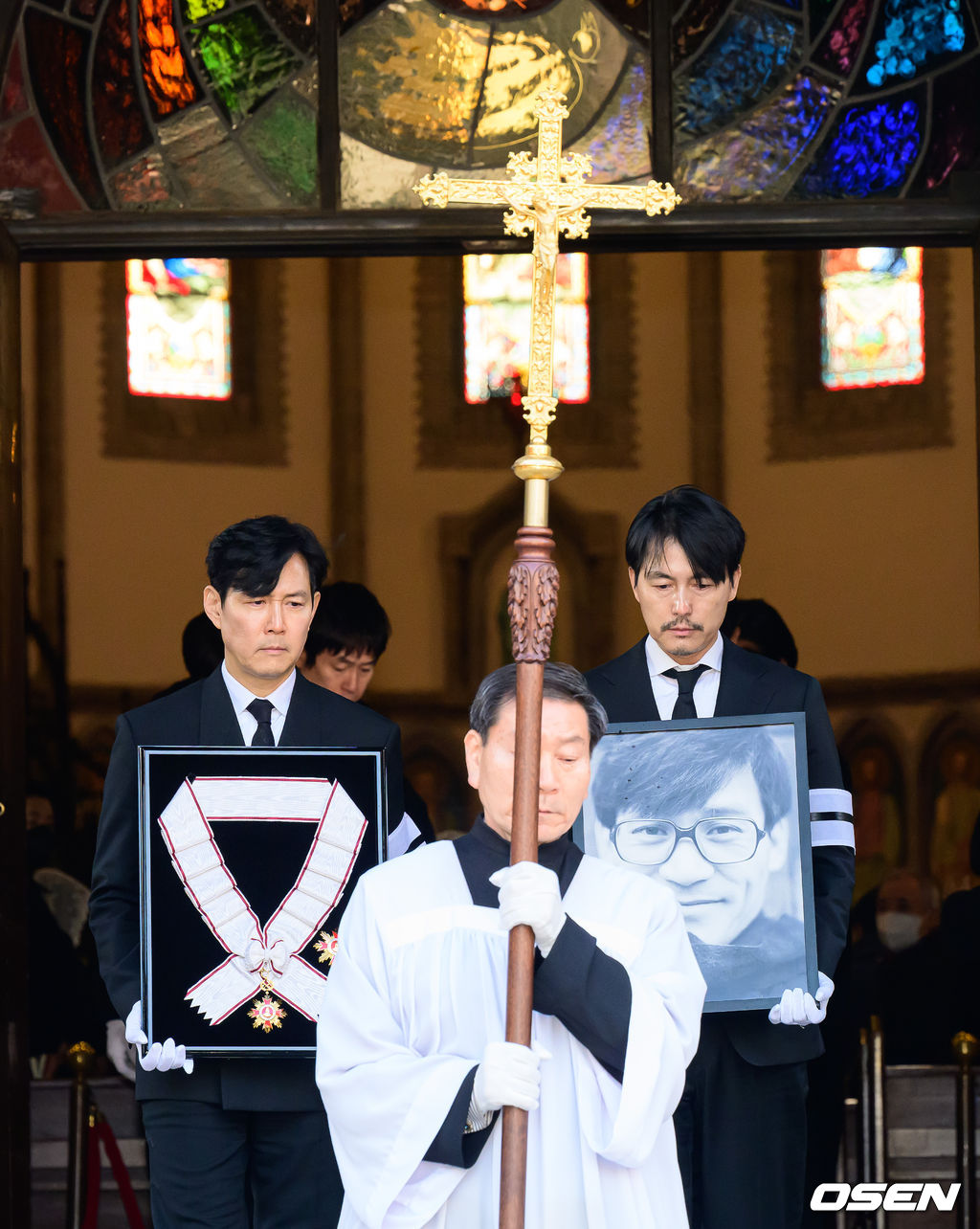 배우 정우성, 이정재가 영정과 금관문화훈장을 들고 운구 행렬과 명동성당을 나서고 있다. 2026.01.09 /jpnews@osen.co.kr