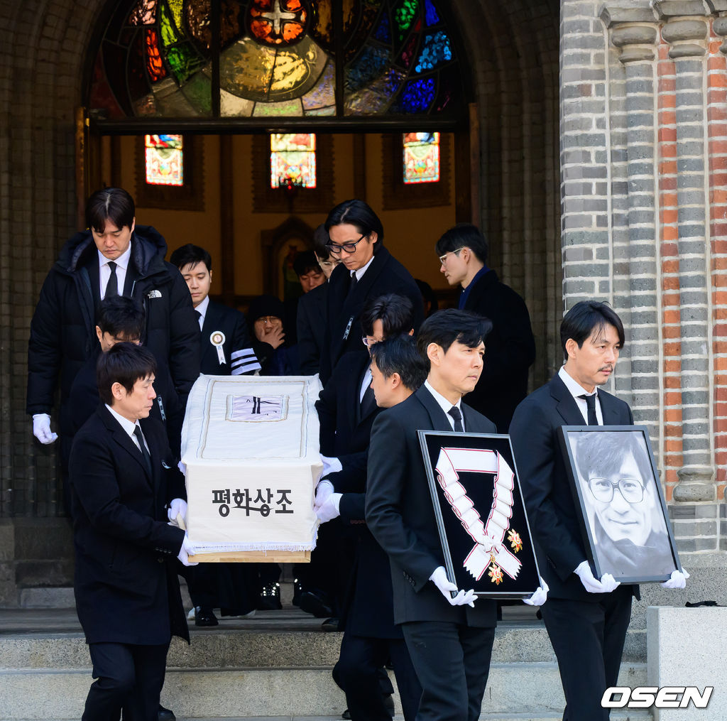 배우 정우성, 이정재가 영정과 금관문화훈장을 들고 운구 행렬과 명동성당을 나서고 있다. 2026.01.09 /jpnews@osen.co.kr