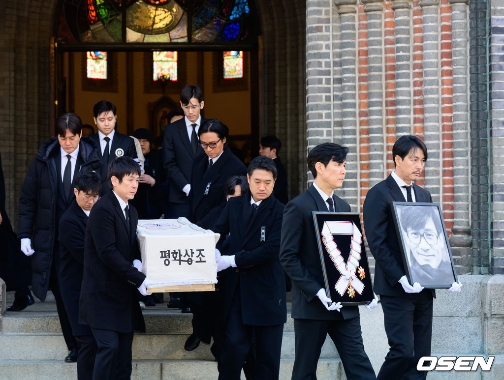 배우 정우성, 이정재가 영정과 금관문화훈장을 들고 운구 행렬과 명동성당을 나서고 있다. 2026.01.09 /jpnews@osen.co.kr