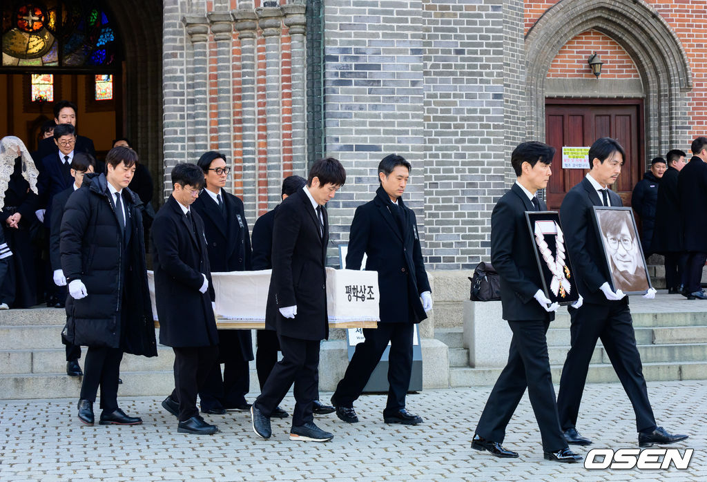 배우 정우성, 이정재가 영정과 금관문화훈장을 들고 운구 행렬과 명동성당을 나서고 있다. 2026.01.09 /jpnews@osen.co.kr