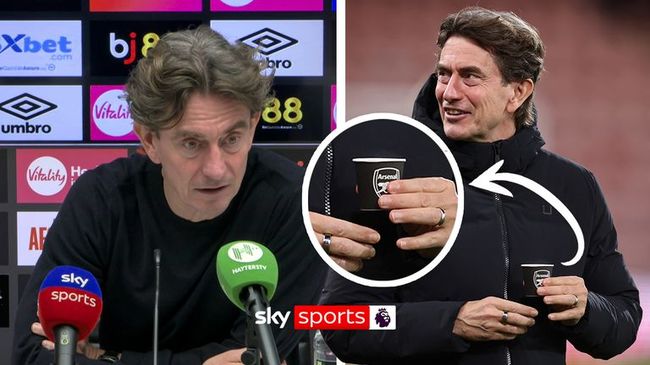 토마스 프랭크 토트넘 홋스퍼 감독이 제대로 찍혔다. 그가 실수로 아스날 엠블럼이 그려진 컵을 들었다가 비난과 조롱을 피하지 못했다.
