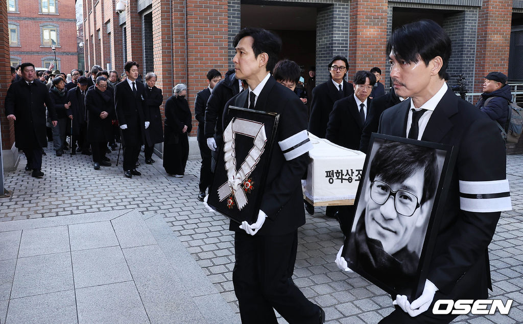 배우 정우성, 이정재가 영정과 금관문화훈장을 들고 운구 행렬과 영결식장으로 들어서고 있다. 2026.01.09 / photo@osen.co.kr