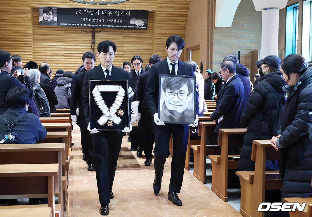 배우 정우성, 이정재가 영정과 금관문화훈장을 들고 운구 행렬과 영결식장을 나서고 있다. 2026.01.09 / photo@osen.co.kr
