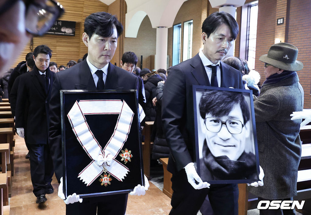 배우 정우성, 이정재가 영정과 금관문화훈장을 들고 운구 행렬과 영결식장을 나서고 있다. 2026.01.09 / photo@osen.co.kr