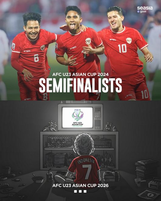 인도네시아 '시시아골'은 7일(한국시간) 소셜 미디어를 통해 "아시아축구연맹(AFC) 23세 이하(U-23) 아시안컵 2024 준결승 진출팀에서...AFC U-23 아시안컵 2026은 TV로 지켜보는 처지라니. 인도네시아 팬들에게는 너무나 아픈 현실"이라며 달라진 인도네시아 U-23 대표팀의 현실을 조명했다.