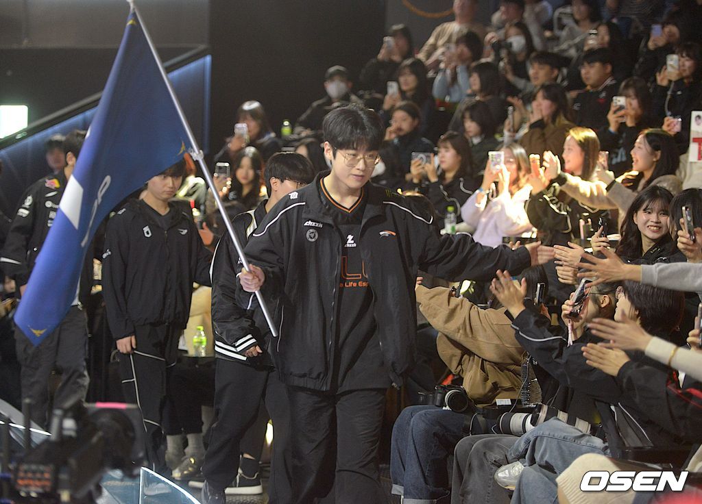 9일 오후 서울 종로 롤파크 LCK아레나에서 '2026 LoL 시즌 오프닝: 데마시아를 위하여' 가 열렸다. '제우스' 최우제, '기인' 김기인, '두두’ 이동주, ‘도란' 최현준, '킹겐' 황성훈으로 구성된 탑 라인이 오프닝 종료후 가장 먼저 입장하고 있다. ‘탑’팀의 주장 ‘제우스’ 최우제가 팀 깃발을 들고 입장하고 있다. / scrapper@osen.co.kr