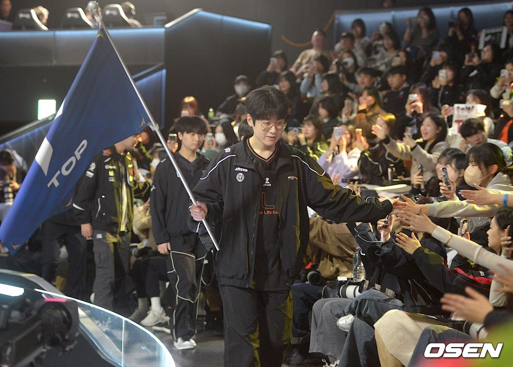 9일 오후 서울 종로 롤파크 LCK아레나에서 '2026 LoL 시즌 오프닝: 데마시아를 위하여' 가 열렸다. '제우스' 최우제, '기인' 김기인, '두두’ 이동주, ‘도란' 최현준, '킹겐' 황성훈으로 구성된 탑 라인이 오프닝 종료후 가장 먼저 입장하고 있다. ‘탑’팀의 주장 ‘제우스’ 최우제가 팬들과 시원시원한 하이파이브를 하면서 입장하고 있다. / scrapper@osen.co.kr