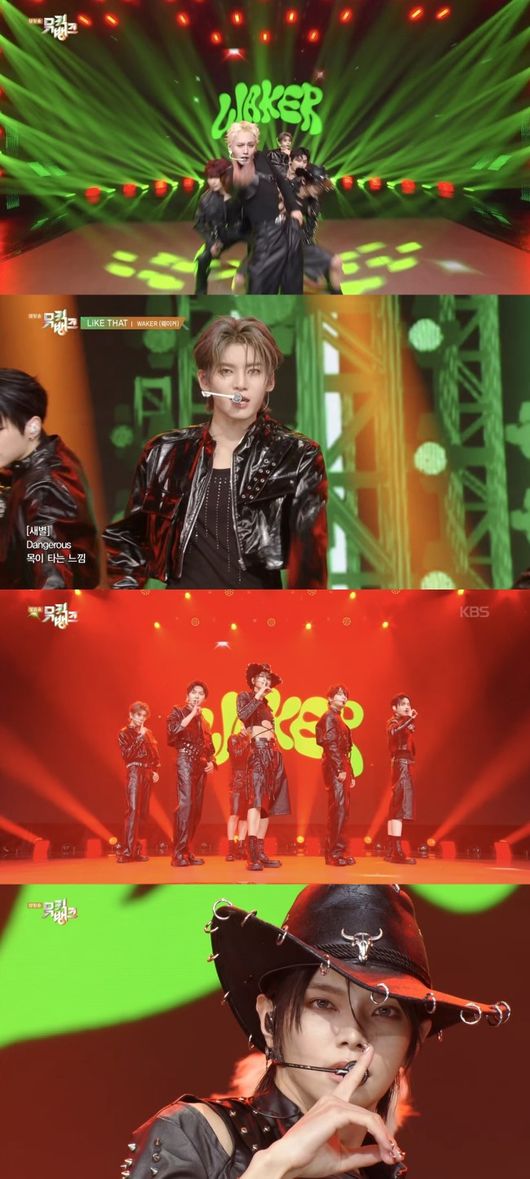 이날 웨이커는 올블랙 가죽 의상을 입고 등장해 탄탄한 피지컬과 치명적인 매력을 발산했다. 이어 타이틀곡 'LiKE THAT'의 세련된 기타 리프와 강렬한 비트에 맞춰 오차 없는 칼군무와 파워풀 댄스를 몰아치며 시청자들의 감탄을 자아냈다.