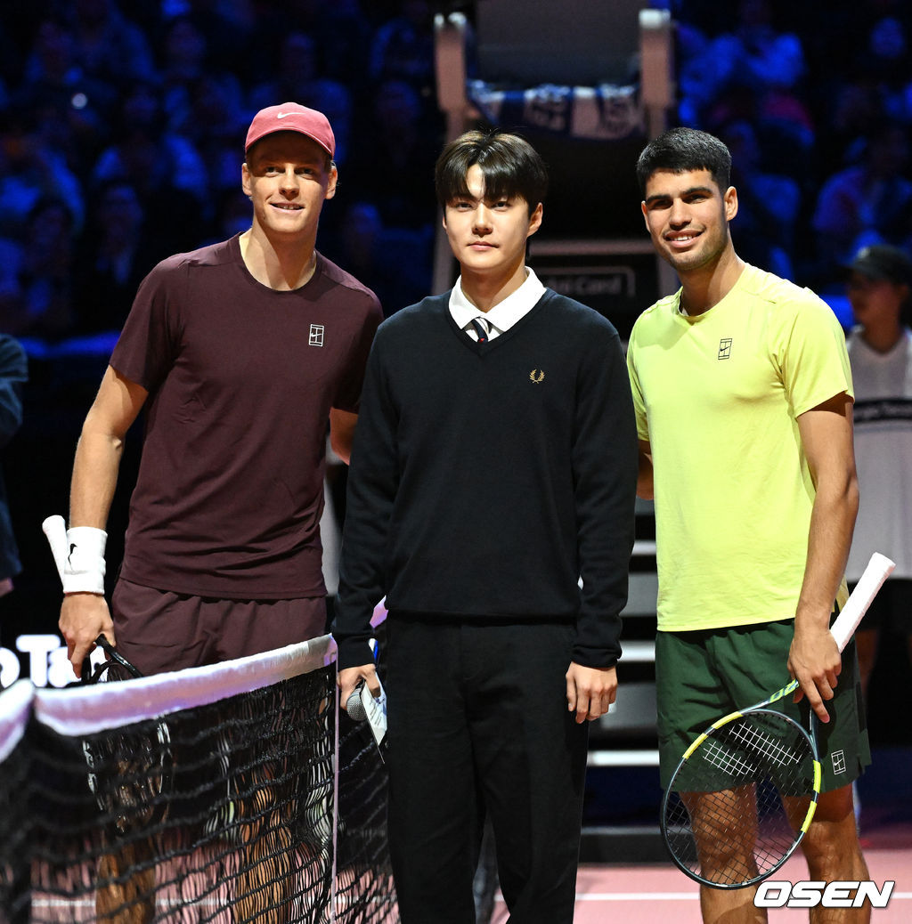 경기에 앞서 엑소 세훈이 신네르, 알카라스와 기념촬영을 하고 있다. 2026.01.10 /sunday@osen.co.kr