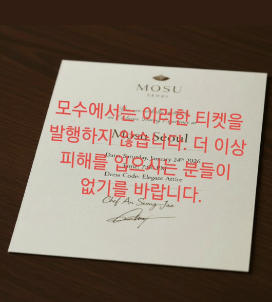 10일 안성재는 개인 SNS를 통해 “모수에서는 이러한 티켓을 발행하지 않습니다. 더 이상 피해를 입으시는 분들이 없기를 바랍니다”라고 글을 게재했다.