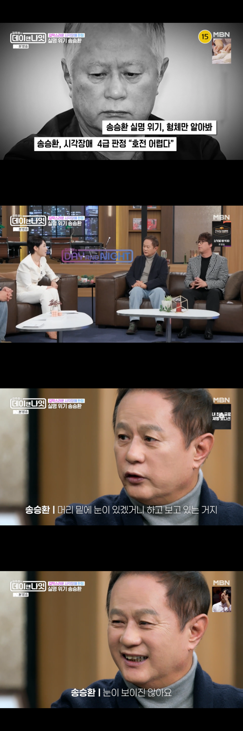 그는 현재 시야 상태에 대해 “완전히 까맣게 보이지 않는 것은 아니다. 안개가 잔뜩 낀 것처럼 흐릿하다”며 “사람의 윤곽은 보이지만 세부적인 것은 잘 보이지 않는다”고 설명했다. 김주하가 “눈을 잘 마주치셔서 불편함이 느껴지지 않는다”고 하자, 송승환은 “사실 눈동자는 보이지 않는다. 머리 윤곽을 보고 그 아래에 눈이 있을 거라고 짐작하며 보는 것”이라고 덧붙였다.