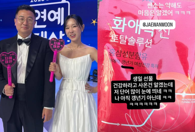 그는 "나 아직 갱년기 아닌데ㅋㅋㅋ"라고 민감함을 드러냈다. 그러면서도 정성을 다해 준비한 문재완을 향해 "쎈스는 약해도 마음은 알겠어ㅋㅋㅋ"라고 덧붙여 웃음을 안겼다.