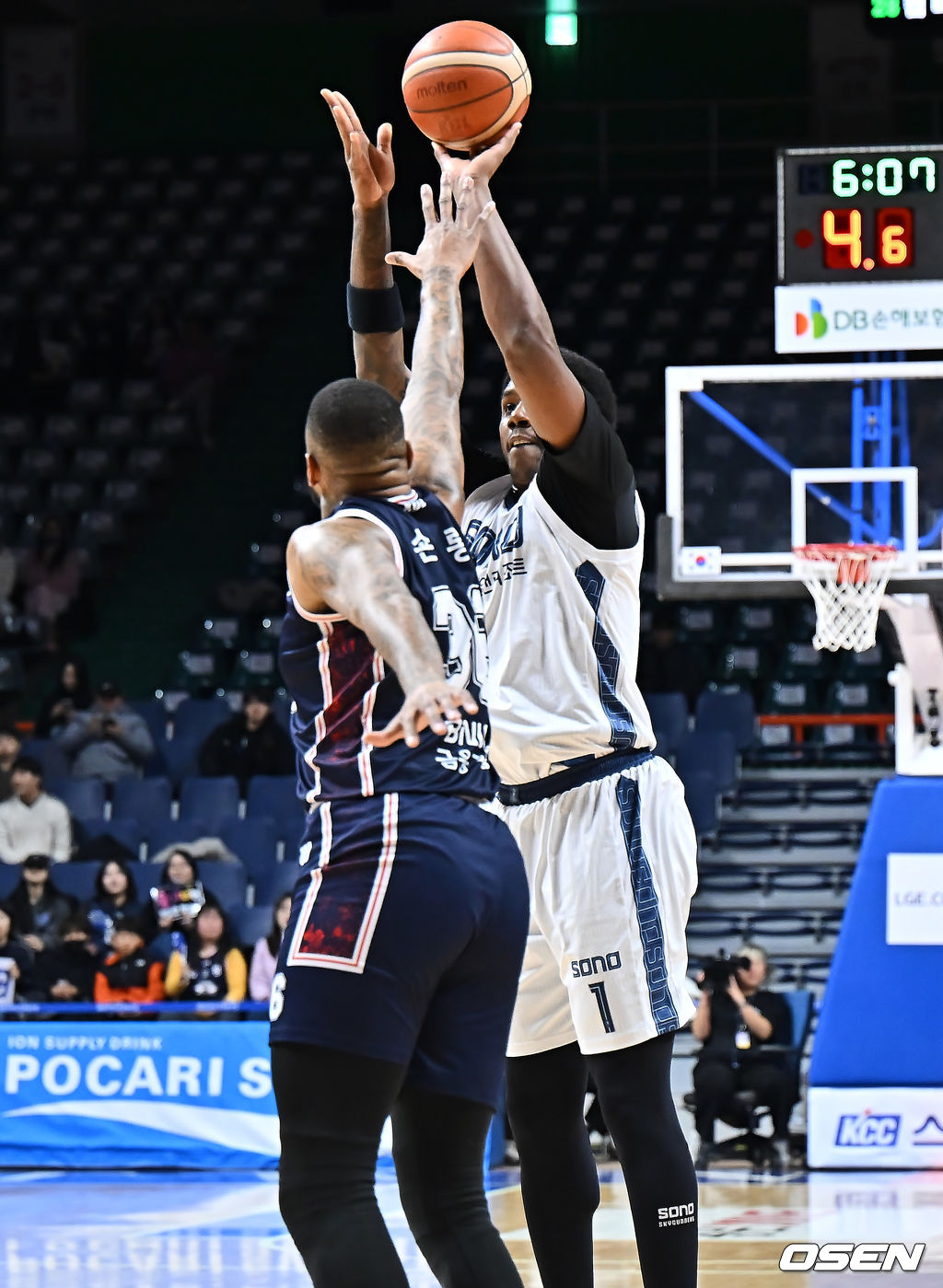 고양 소노 네이던 나이트가 부산 KCC 숀롱의 마크를 피해 슛을 시도하고 있다. 2026.01.12 / foto0307@osen.co.kr