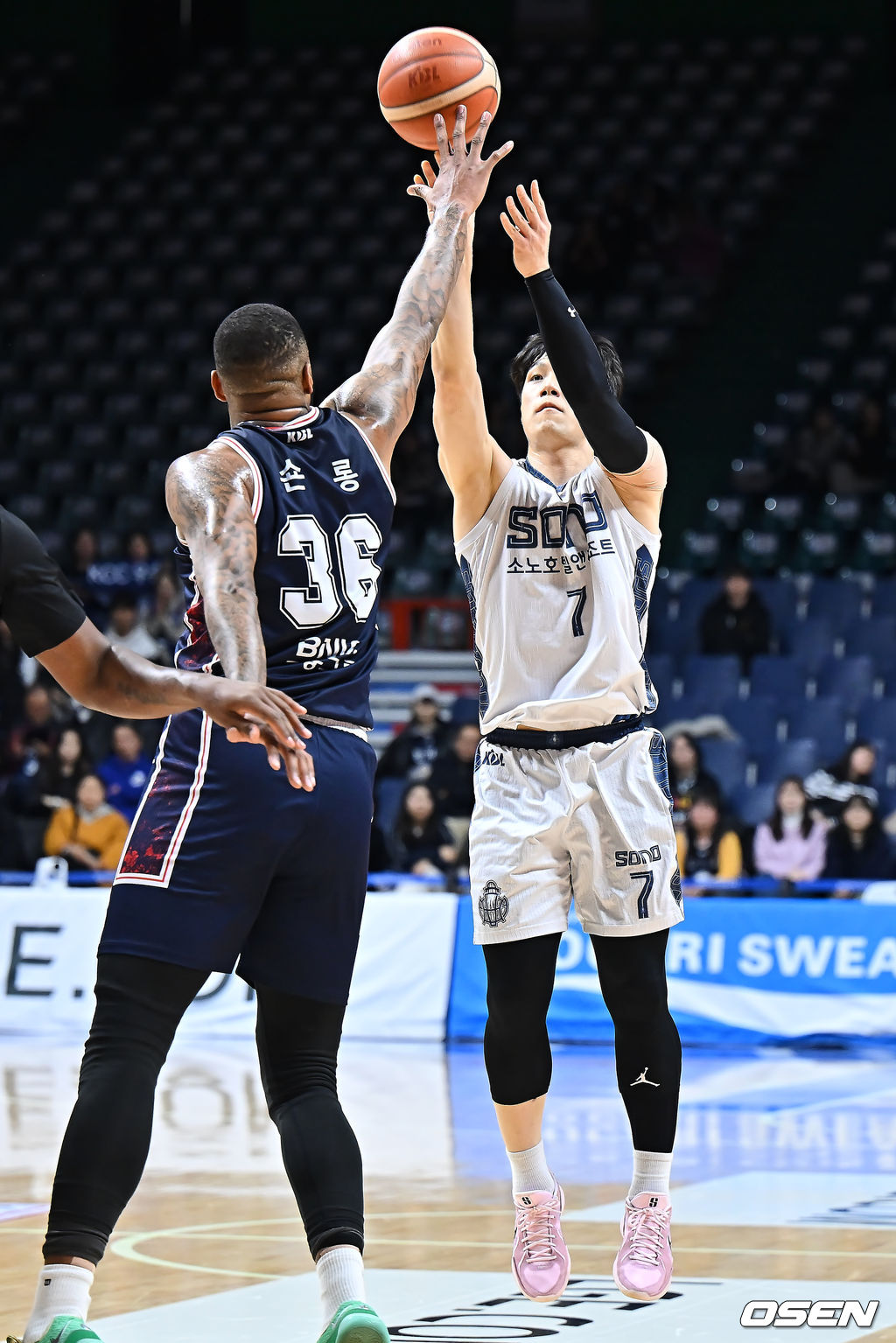 고양 소노 홍경기가 부산 KCC 숀롱의 마크를 피해 3점슛을 시도하고 있다. 2026.01.12 / foto0307@osen.co.kr
