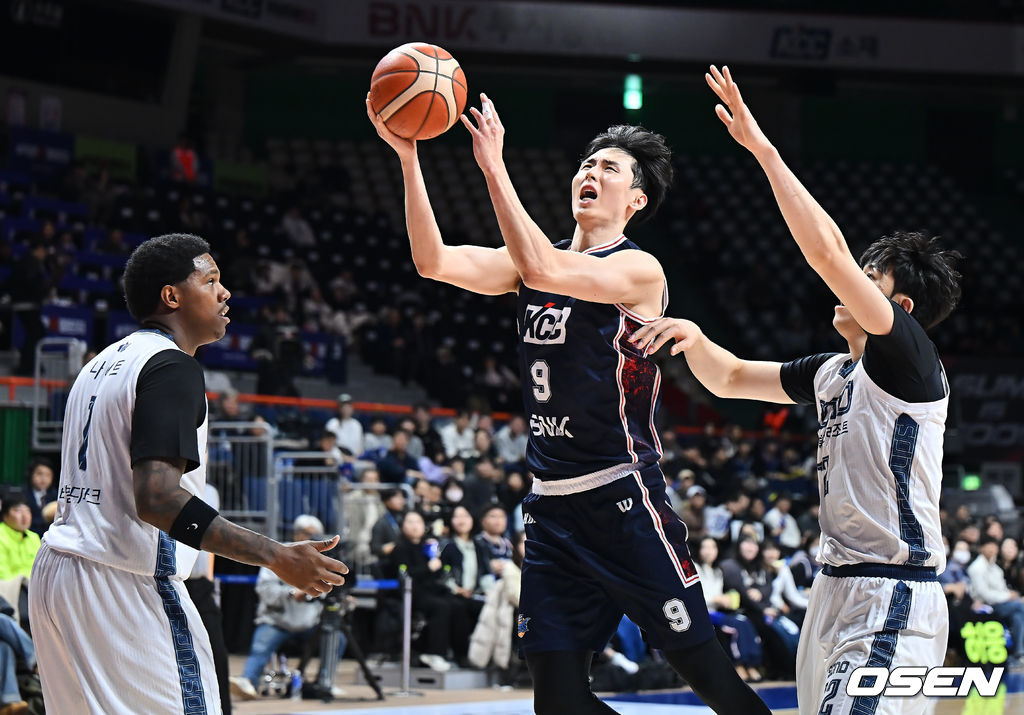 부산 KCC 송교창이 고양 소노 강지훈의 마크를 피해 골밑슛을 시도하고 있다. 2026.01.12 / foto0307@osen.co.kr