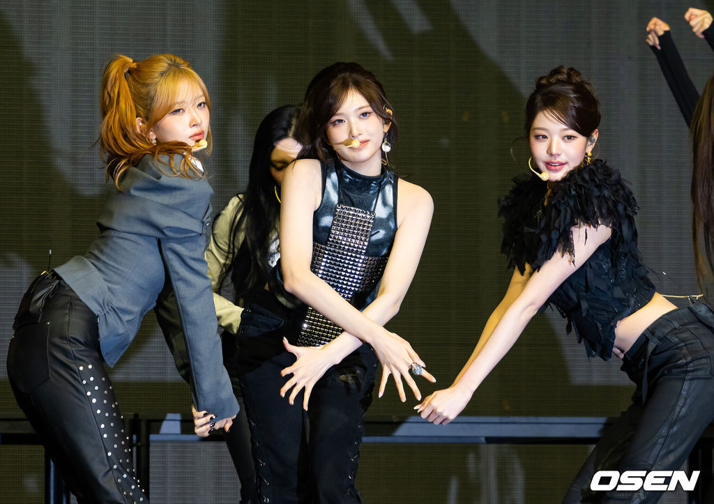 그룹 아이브 레이, 이서, 장원영이 무대 위에서 화려한 무대를 선보이고 있다. 2026.02.23 / rumi@osen.co.kr