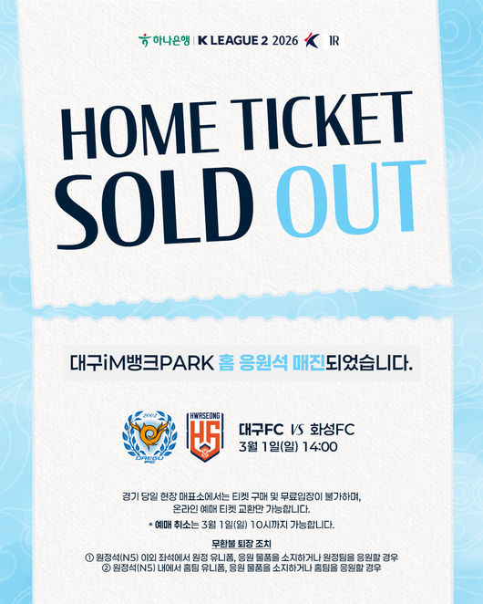 오는 3월 1일 오후 2시 대구iM뱅크PARK에서 열리는 화성FC와의 ‘하나은행 K리그2 2026’ 1라운드 홈경기 홈 응원석이 온라인 예매로 경기 2일 전인 27일에 전석 매진됐다.