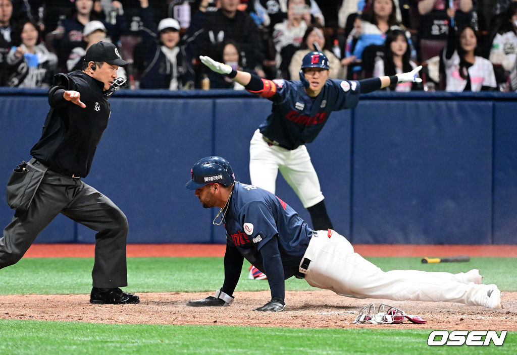 연장 10회초 1사 1,3루에서 롯데 레이예스가 한동희의 3루 땅볼에 홈에서 키움 김건희의 태그에 앞서 세이프되고 있다. 2026.04.11 / jpnews@osen.co.kr