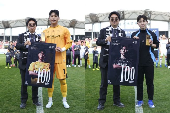 성남은 지난 12일 탄천종합운동장에서 열린 하나은행 K리그2 2026 7라운드 안산그리너스와 홈경기 시작에 앞서 두 선수의 100경기 출전을 축하하는 자리를 마련했다. 각각 성남의 공격을 이끌고, 골문을 지키는 박상혁과 이광연은 지난 4일 화성FC 원정 경기에서 나란히 100경기 출전을 달성했다.