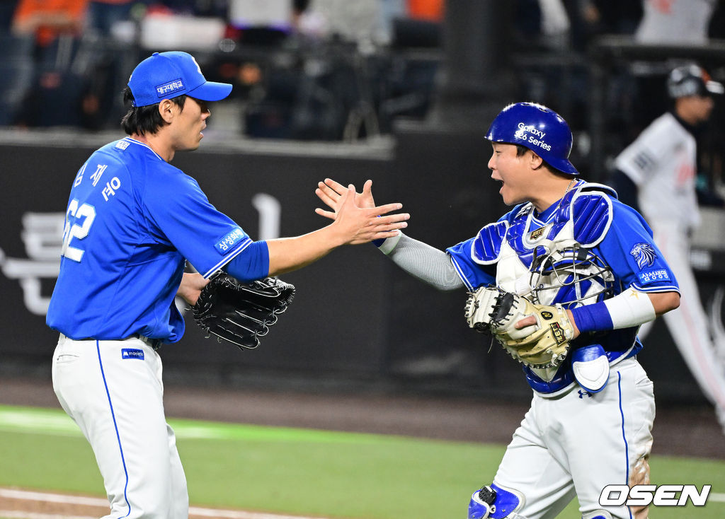 경기를 마치고 삼성 김재윤, 박세혁이 승리를 기뻐하고 있다. 2026.04.14 / jpnews@osen.co.kr
