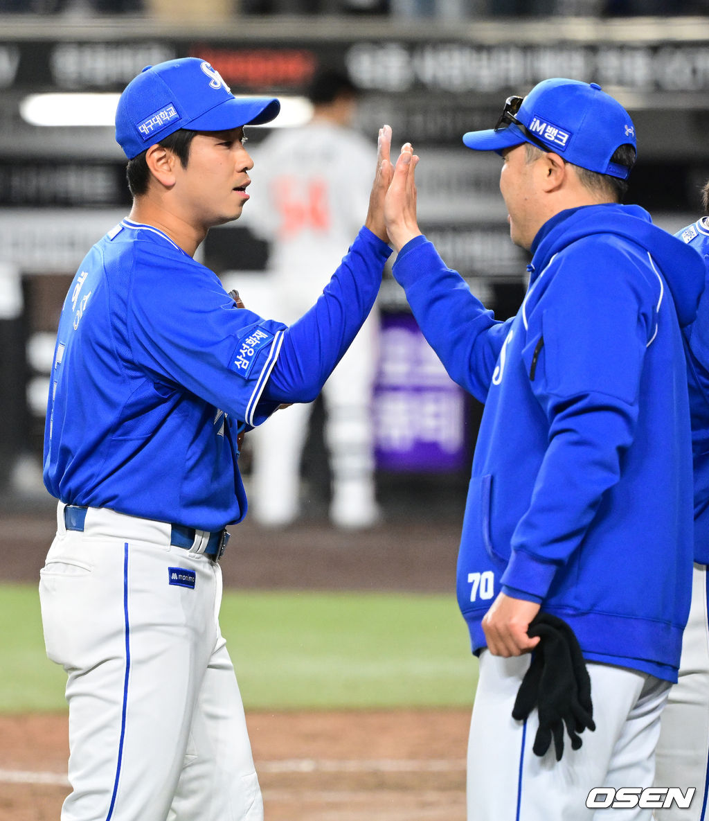 경기를 마치고 삼성 박진만 감독이 이해승과 승리 하이파이브를 하고 있다. 2026.04.14 / jpnews@osen.co.kr