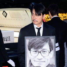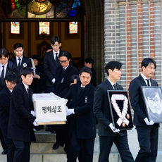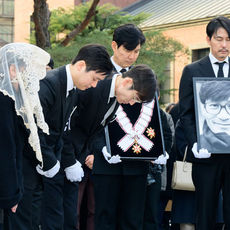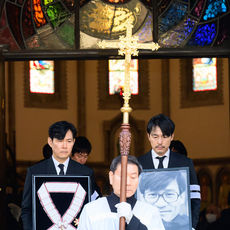 故 안성기 장례 미사, 이정재-정우성 영정과 훈장 들고
