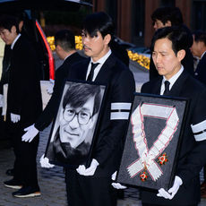 2026.01.09 08: 14정우성-이정재, 故 안성기 영정과 훈장 들고