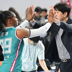 승리 하이파이브 하는 한국도로공사 김종민 감독과 모마