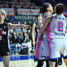 2026.02.21 16: 19연장 승리 기쁨 나누는 삼성생명 선수들