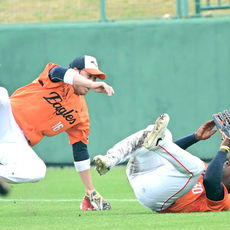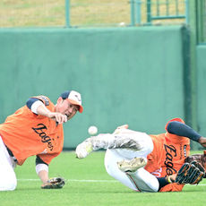 2026.02.22 14: 27애매한 위치의 뜬공 잡으려다 충돌하는 한화 하주석-페라자