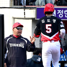 2026.04.11 16: 41동점 1타점 희생플라이 친 김도영 맞이하는 KIA 이범호 감독