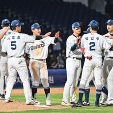 2026.04.14 21: 31승리 하이파이브하는 NC 다이노스 선수들