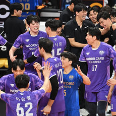 역전승리 기쁨 나누는 우리카드 선수들